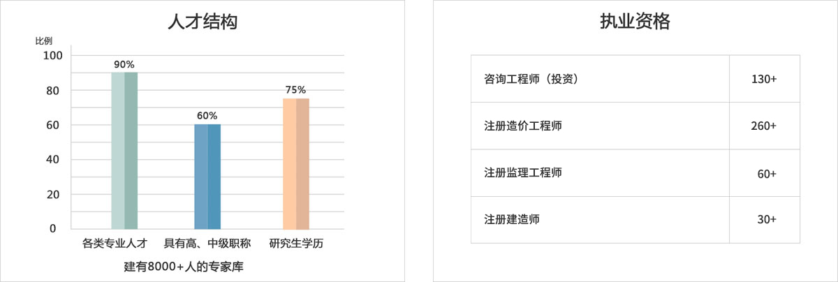 各类专业人员占职工总数90%以上,具高、中级职称者占60%以上;在从事咨询的专业技术人员中,研究生以上学历占75%;公司拥有注册咨询工程师、招标师、造价工程师、监理工程师、一级建造师等执业资格200多人次;公司拥有由各著名院校、科研设计单位、大型企业、行业管理等领域数千名专家组成的专家支持网络。